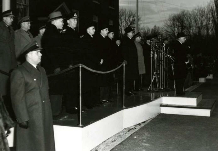 Derrière / Behind Massey: Brooke Claxton, Ministre de la défense, Colonel Marcellin Lahaie, Commandant